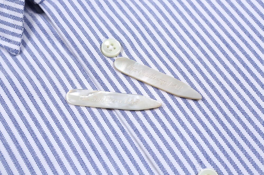 자연스러운 광택과 고급스러운 색감을 지닌 트로카스(Trocas) 자개 단추와,동일한 소재의 자개 칼라 스테이를 개발하여 레이저 로고 각인을 더했습니다.(*Trocas: 남태평양산 진주조개에서 채취한 고급 자개 소재로, 은은한 광택과 견고함이 특징입니다.)